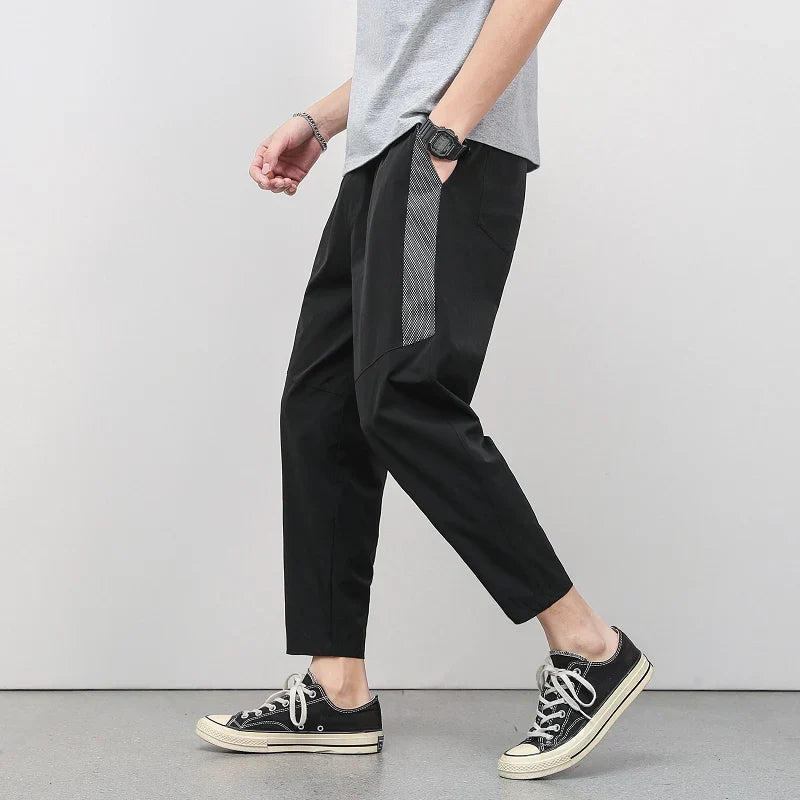 A relaxed, casual design in cool ice silk, cropped to a clean, tapered ankle length. A side panel adds a subtle accent, while the lightweight, breathable fabric keeps things dry and comfy, easy to style, and perfect for versatile everyday wear.